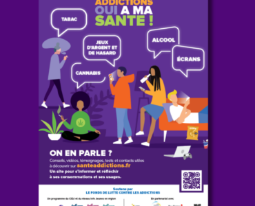 Affiche « Écrans » du programme Non aux addictions, oui à ma santé, un programme national d’information et de sensibilisation des jeunes aux addictions. En 2025, l’addiction aux écrans rejoint les 4 addictions du programme : cannabis, alcool, tabac et jeux d’argent et de hasard. Mandaté par la Caisse Nationale d’Assurance Maladie pour mettre en